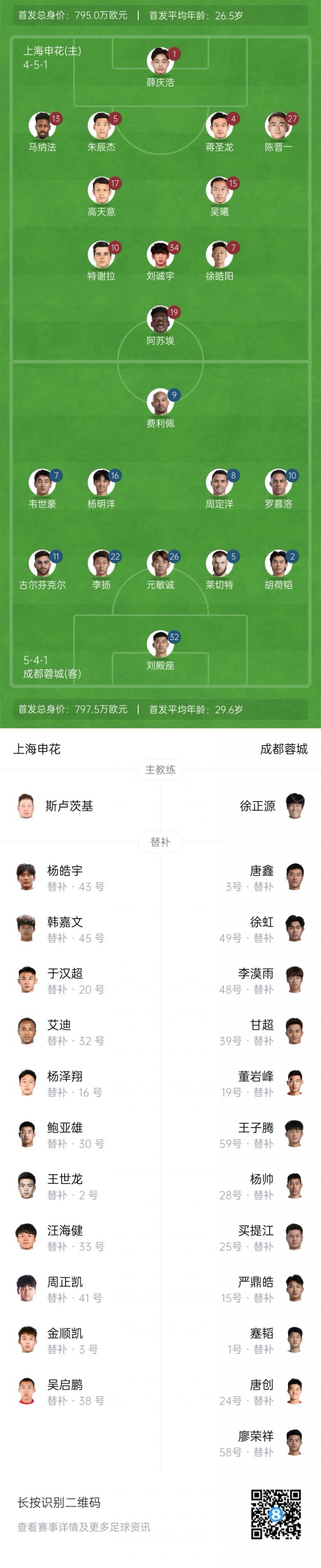 申花与蓉城首发阵容揭晓 三外援对抗四外援 刘诚宇 阿苏埃 韦世豪出场_中超直播免费直播视频直播