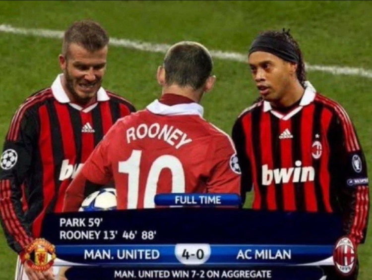 然而,事实却大相径庭。这张图片其实经过了精心的后期加工。回溯到2009-10赛季的欧冠1/8决赛次回合,曼联在那场比赛中确实以4-0的比分战胜了米兰,然而鲁尼只为球队打入了两球,其他两粒进球分别来自朴智星和弗莱彻之脚。而且,值得一提的是,米兰在那场比赛中穿着的是黑色球衣,与鲁尼身边的红黑条纹相去甚远。