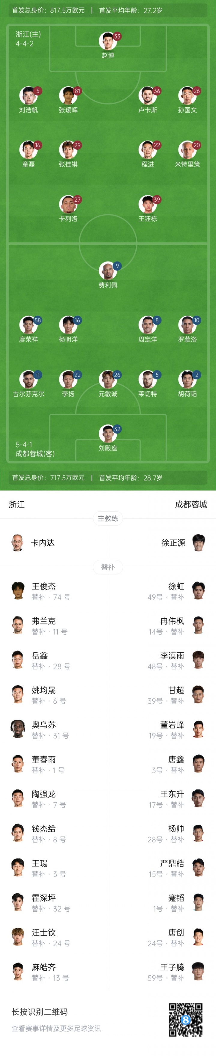 北京时间今晚20点,中超第26轮将迎来一场令人期待的对决,浙江对战蓉城,赛前两队的首发阵容已经公布。