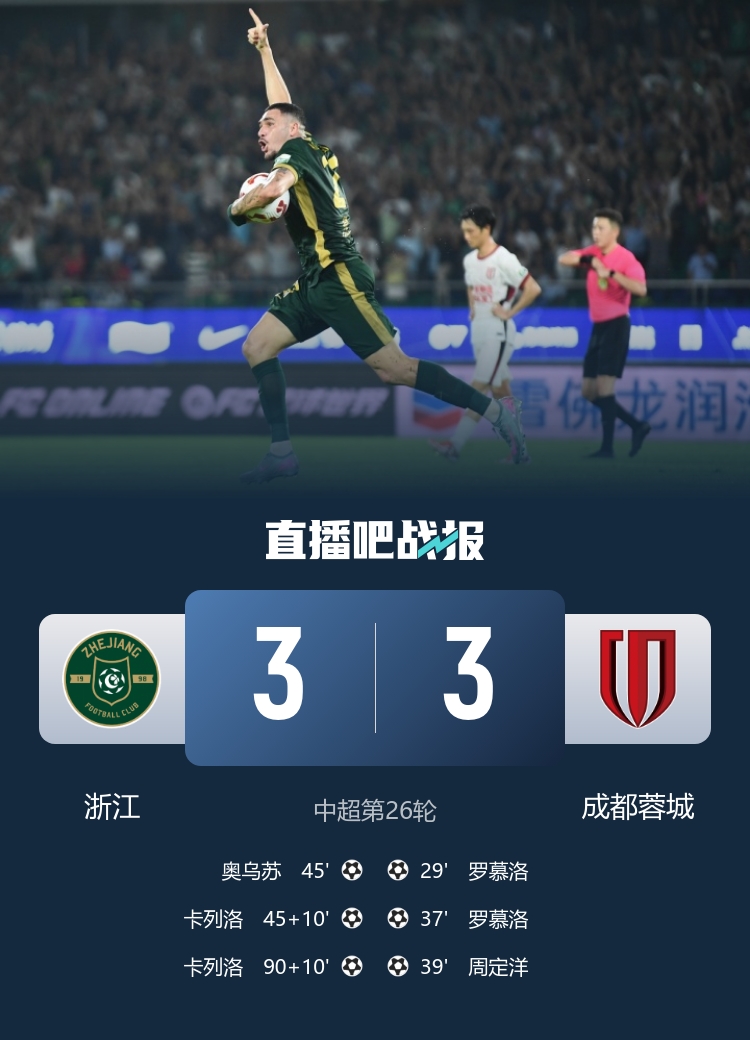 蓉城激战三球皆失平起浙江 卡列洛双响并在百分钟时刻扳平 王钰栋助力_中超直播