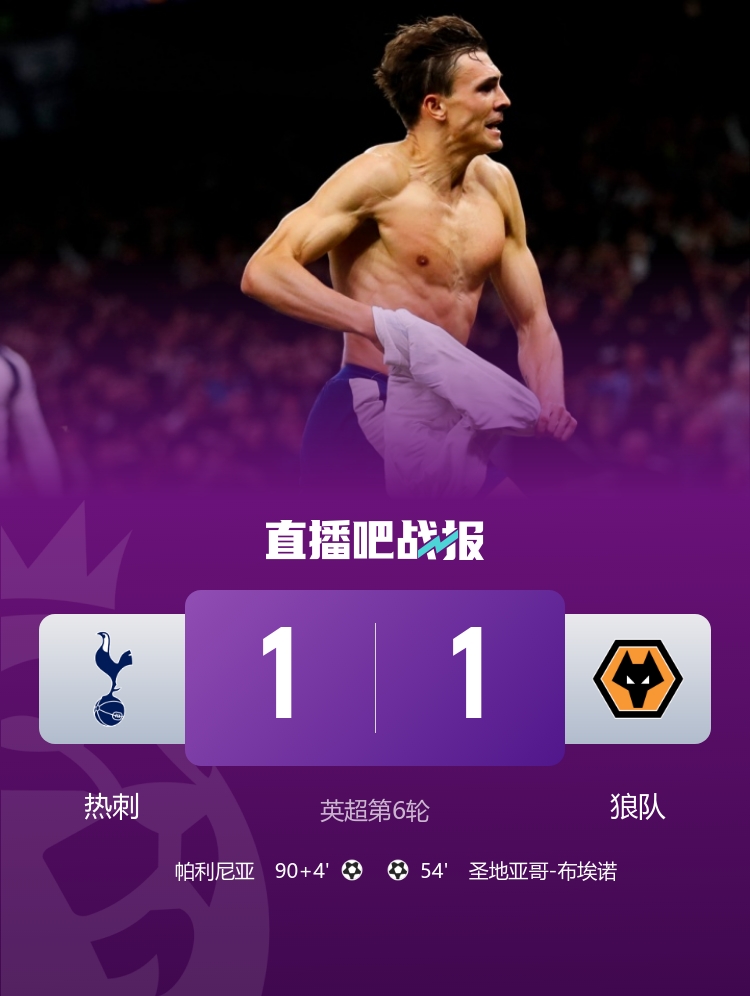 热刺在最近四轮比赛中仅取得一场胜利 对阵狼队战成平局持续六场不胜 帕利尼亚在补时阶段扳平比分_英超直播免费