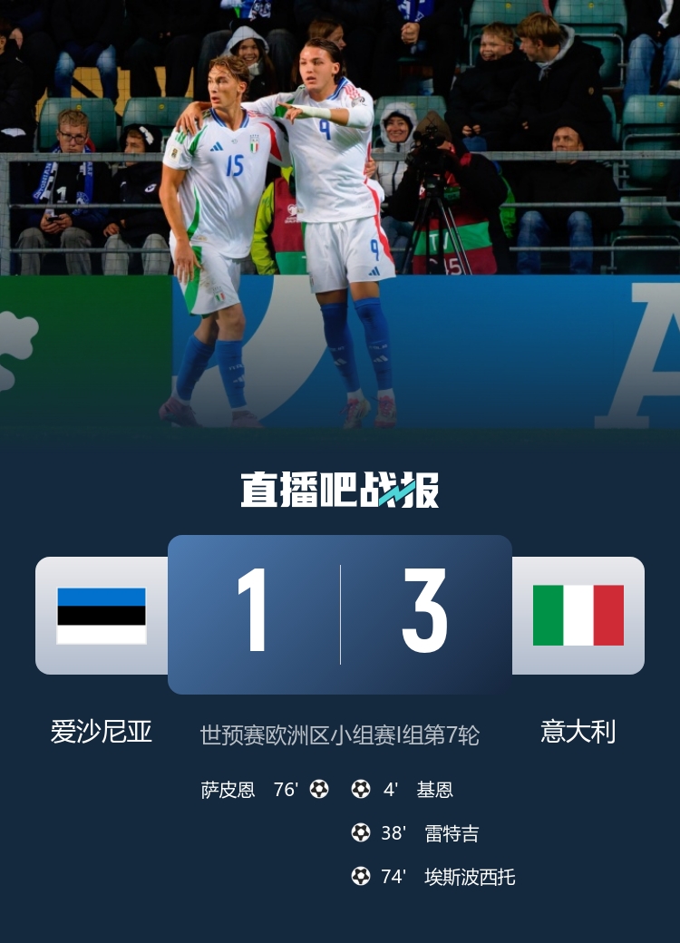 进入下半场,意大利再度发力,第74分钟,埃斯波斯托在左路的突破与斯皮纳佐拉配合后进球,扩大比分至3-0。爱沙尼亚虽在第76分钟通过萨皮恩的机智进球扳回一城,但最终还是无力回天,比赛以3-1结束。意大利在小组赛中取得了四连胜,不过仍落后于榜首球队6分,显然他们的夺冠之路依然任重道远。